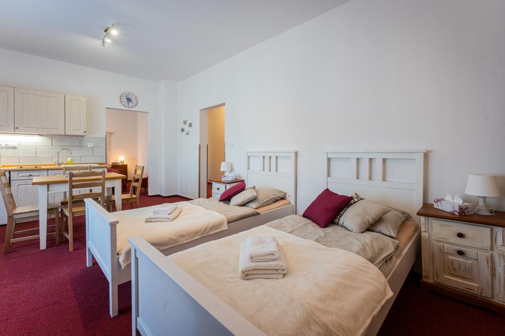 Pension u Babky Bylinkarky offers comfortable and spacious apartments for 2 – 6 persons with private bathroom and shower or bath and toilet. Apartments are equipped with kitchenette as well. Each apartment is unique, stylishly decorated and carries the name of favorite herbs of Babka Bylinkarka.